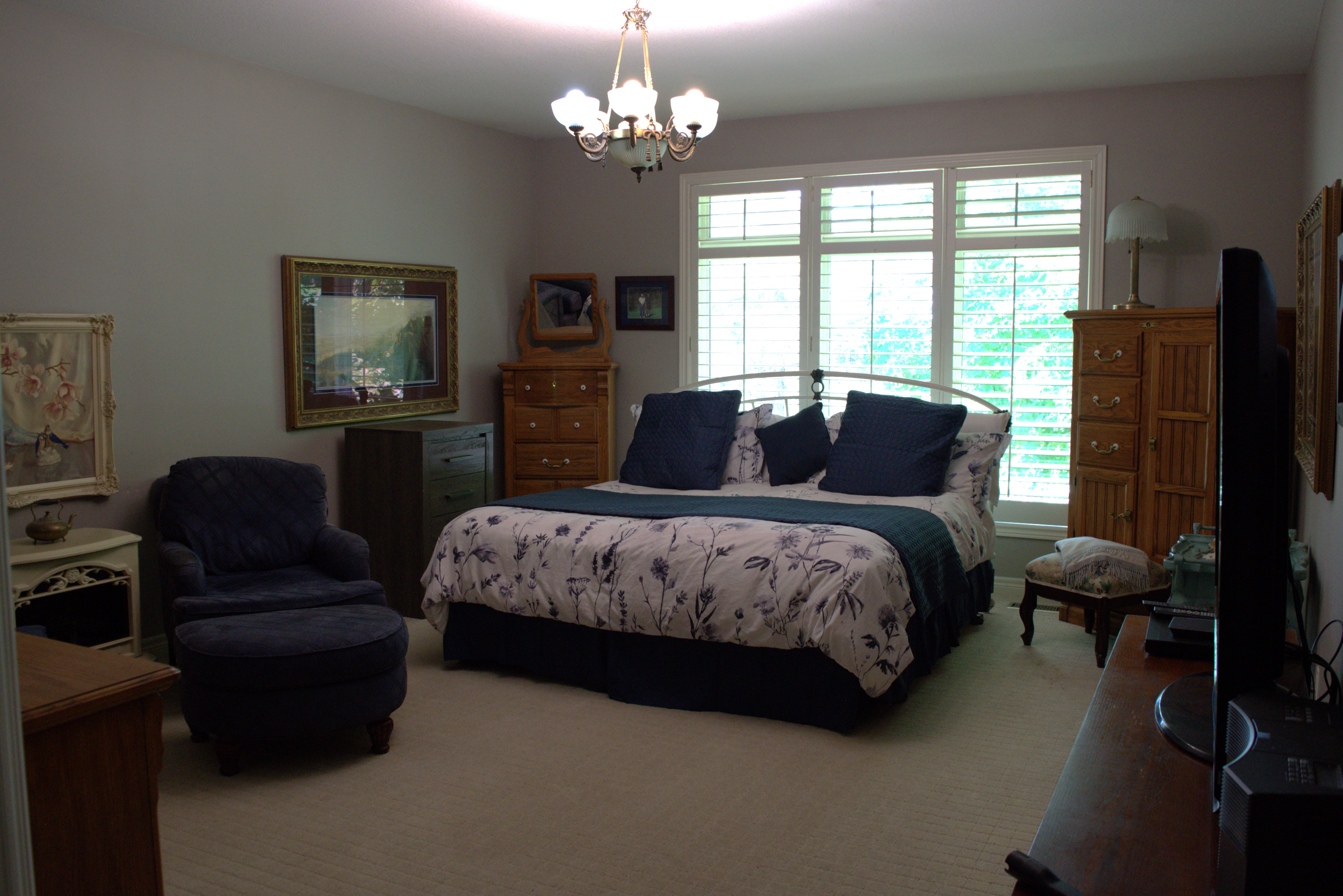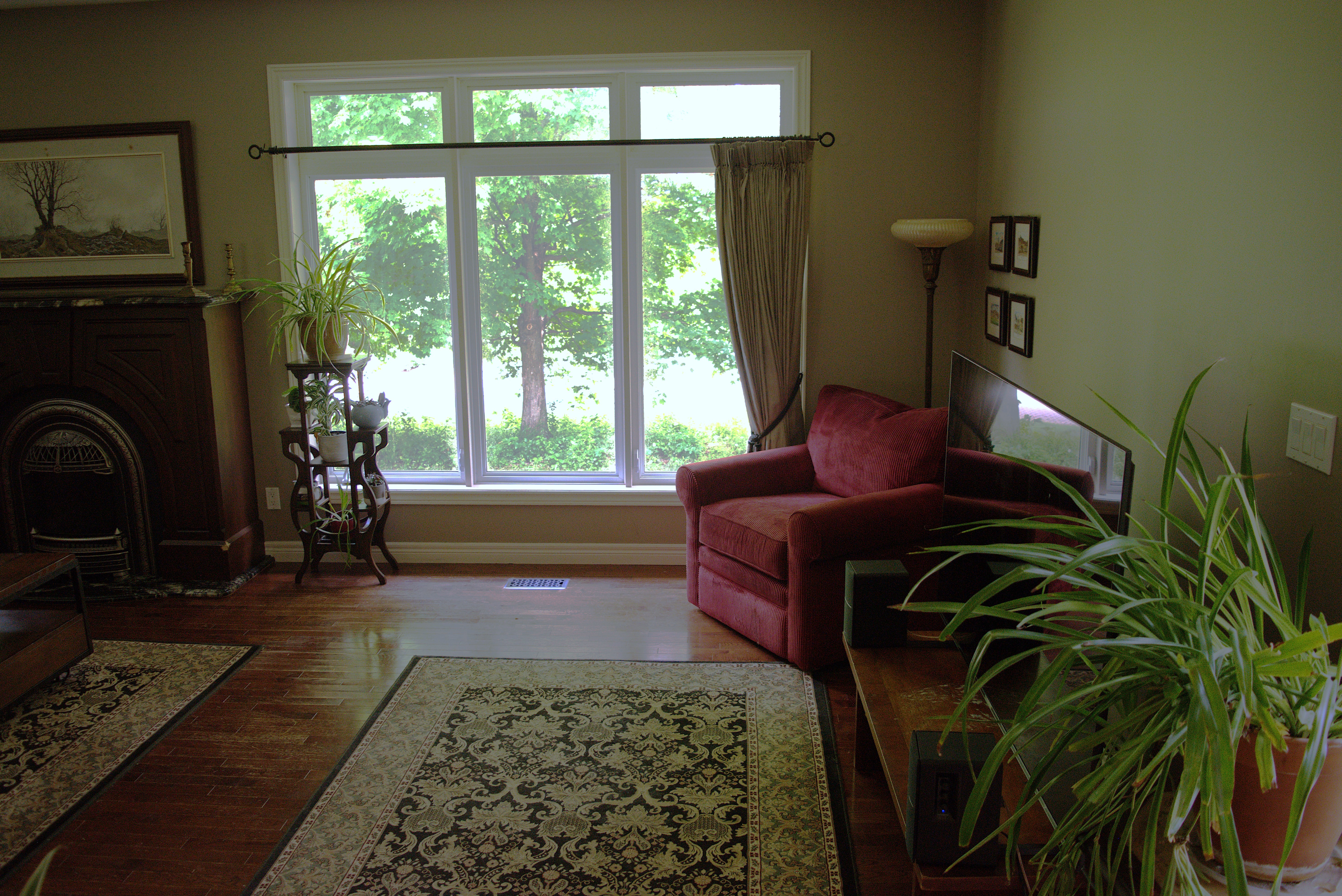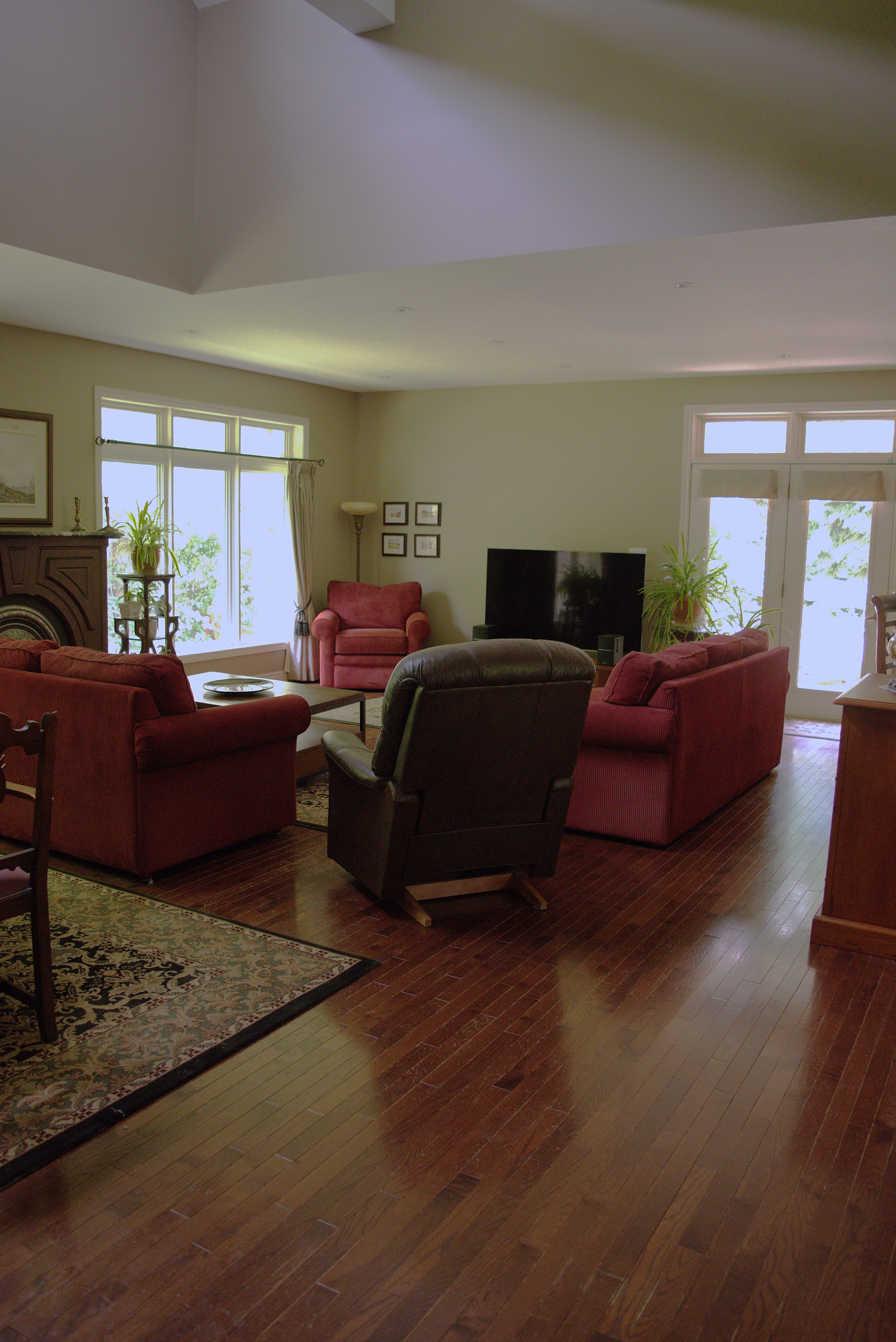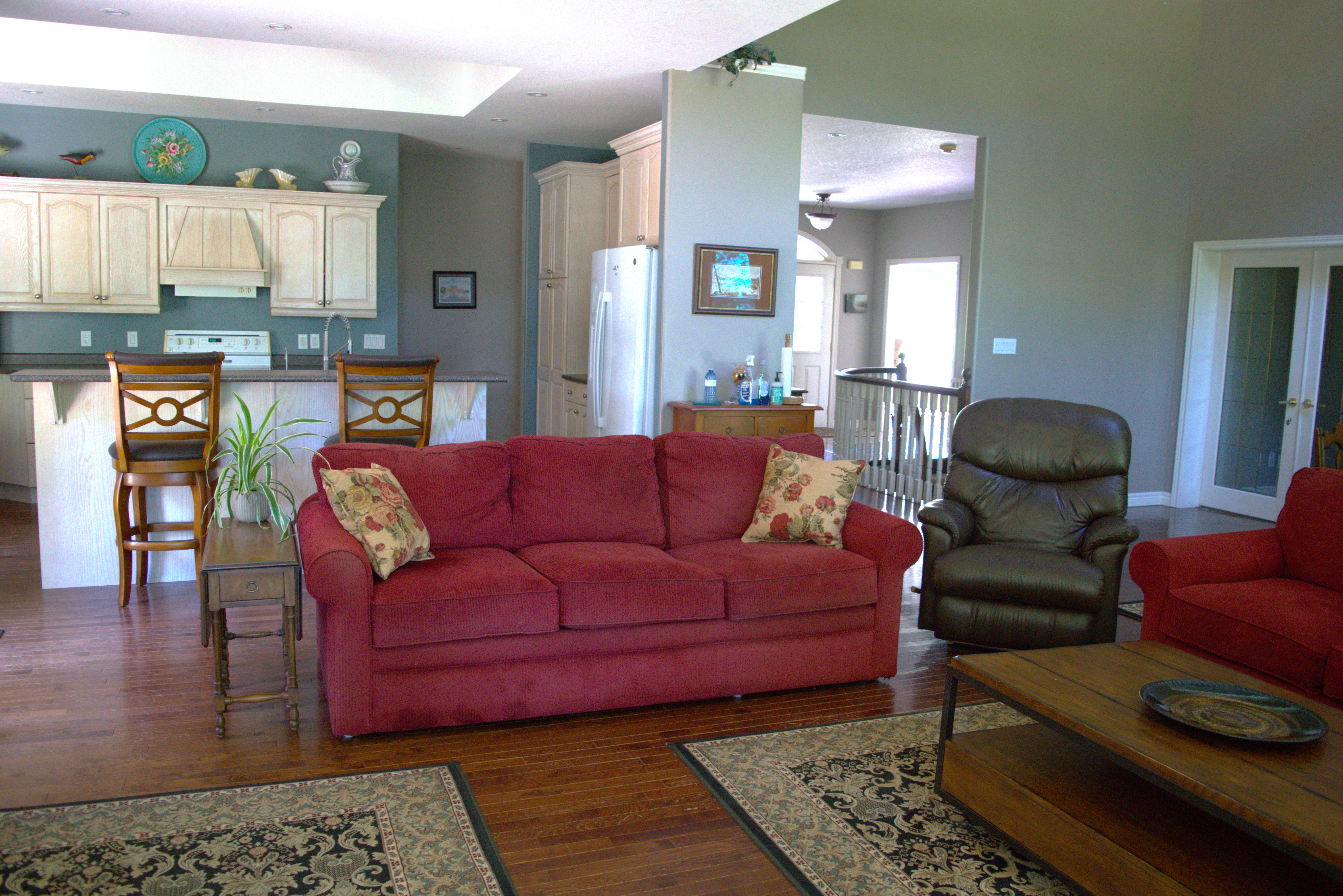 Inside, the open floor plan has the primary bedroom suite with walk-in closet and four piece bathroom, the large family room and dining room area, with high vaulted ceiling, hardwood floors, windowed back wall, complete with a beautiful Valor Windsor Arch gas coal-look fireplace with a remote that works without the need for electricity in the event of an outage and heats approx. 1,100 sq. ft, the kitchen, a three piece bathroom, the laundry room and two additional rooms for use as bedrooms, offices or dens.